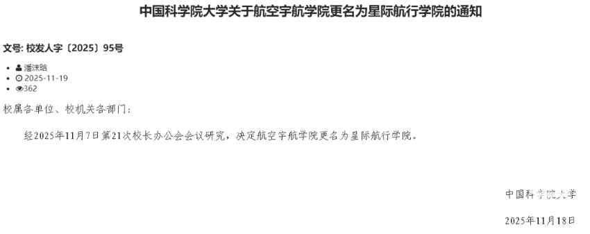 国科大官方确认!航空宇航学院正式更名为星际航行学院,11月7日校长办公会审议通过,18日发内部通知,选课系统已启用新名,官网后续完成“流程”后更新。